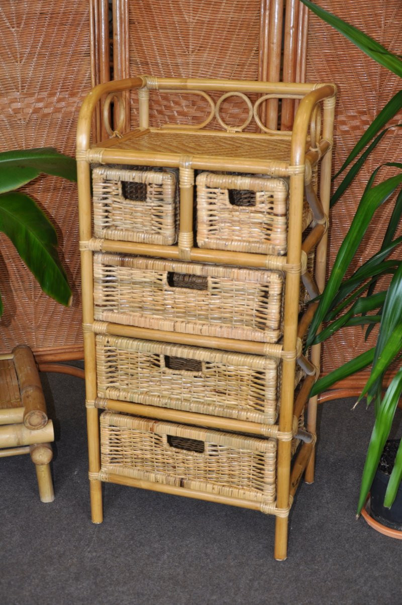 Ratanový nábytek - ratanová komoda 3+2 zásuvky. Konstrukce i výplet jsou vyrobeny z přírodního ratanu. Komoda je praktickým doplňkem v domácnosti pro odkládání různých věcí nebo jako prádelník | Velikost výrobku 45x35x96 cm. Barva ratanové konstrukce i výpletu je medová.