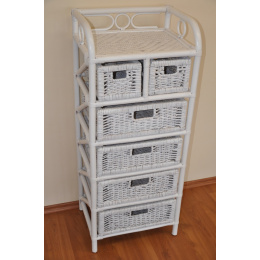 Ratanový nábytek - ratanová komoda 4+2 zásuvky. Konstrukce i výplet jsou vyrobeny z přírodního ratanu. Komoda je praktickým doplňkem v domácnosti pro odkládání různých věcí nebo jako prádelník. | Velikost výrobku 45x35x115 cm. Barva ratanové konstrukce i výpletu je bílá.