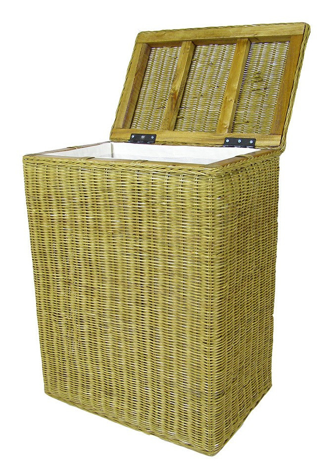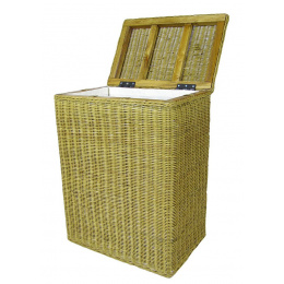 Prádelní koš s konstrukcí z masivního dřeva a výpletem z přírodního ratanu. | Barva ratanového výpletu je medová. Velikost prádelního koše je 45x30x61 cm. Vnitřní část koše je polstrována bílou látkou.