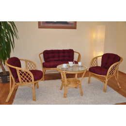 Ratanový nábytek - ratanová sedací souprava Bahama je vyrobena z přírodního ratanu s barvou konstrukce v medovém odstínu. Souprava obsahuje pohovku, 2 křesla, stolek se sklem a kompletní sadu polstrů vyrobených v České republice. | Barva ratanové konstrukce i ratanového výpletu je medová. Velikost pohovky je 115x66x73 cm, nosnost pohovky je 150 kg. Velikost křesla je 68x66x73 cm, nosnost křesla je 110 kg. Výška sedu je 44 cm. Stolek má výšku 55 cm, průměr stolku je 60 cm. Spoje ratanové konstrukce jsou šroubovány. Polstry na tuto sedací soupravu Bahama jsou vyrobeny v České republice. Polstry jsou vyrobeny z kvalitní látky a vyznačují se vysokou kvalitou zpracování.Polstry pro nás vyrábí firma AXIN Cuschions s.r.o., která zaměstnávávýhradně místní vyučené švadleny z České republiky. Tímto způsobem sesnažíme podporovat výrobu a zaměstnanost v naší republice.Náplň polstrů je drcený molitan a polstry lze prát ručně na 40o C.