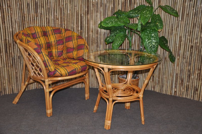 Ratanová sedací souprava je vyrobena z přírodního ratanu s barvou konstrukce odpovádající fotografii výrobku,obsahuje 1 křeslo a stolek se sklem, polstry jsou vyrobeny v ČESKÉ REPUBLICE. | Barva konstrukce je medová, rozměr křesla 68x66x73 cm, výška sedu 44 cm, stolek výška 55 cm, průměr stolku 60 cm, nosnost křesla 110 kg. Spoje konstrukce jsou šroubovány. Polstry lze prát ručně na 40oC nebo čistit v čistirně