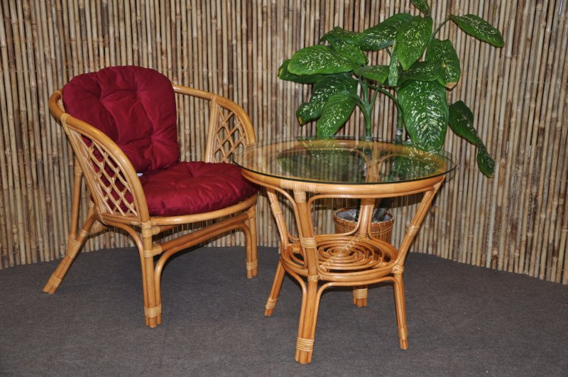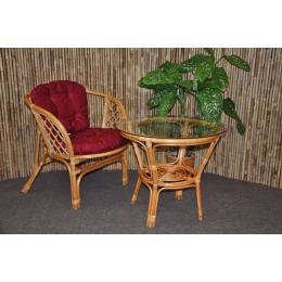 Ratanová sedací souprava je vyrobena z přírodního ratanu s barvou konstrukce odpovádající fotografii výrobku,obsahuje 1 křeslo a stolek se sklem, polstry jsou vyrobeny v ČESKÉ REPUBLICE. | Barva konstrukce je medová, rozměr křesla 68x66x73 cm, výška sedu 44 cm, stolek výška 55 cm, průměr stolku 60 cm, nosnost křesla 110 kg. Spoje konstrukce jsou šroubovány. Polstry lze prát ručně na 40oC nebo čistit v čistirně