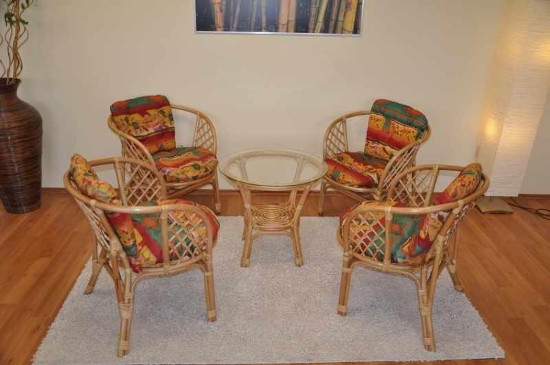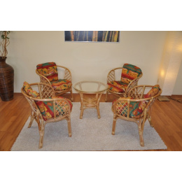 Ratanová sedací souprava Bahama se skládá ze čtyřech křesel s polstry a stolku se skleněnou deskou. | Sedací souprava je vyrobena z přírodního ratanu. Barva ratanové konstrukce i výpletu je medová. Velikost křesla 67x65x72 cm. Nosnost křesla je 110 kg. Výška sedu křesla je 42 cm. Průměr skleněné desky stolku je 60 cm, výška stolku je 56 cm. Polstry jsou vyrobeny v Indonesii.