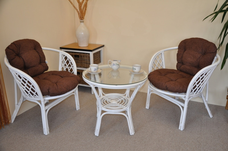 Ratanová sedací souprava je vyrobena z přírodního ratanu s barvou konstrukce odpovádající fotografii výrobku,obsahuje 2 křesla a stolek se sklem, kompletní sadu polstrů vyrobených v ČESKÉ REPUBLICE. | Barva ratanové konstrukce i výpletu je bílá. Velikost křesla je 68x66x73 cm, výška sedu 44 cm,nosnost křesla 110 kg. Stolek výška 55 cm, průměr stolku 65 cm. Hlavní spoje ratanové konstrukce jsou šroubovány. Polstry na tuto sedací soupravu Bahama jsou vyrobeny v České republice. Polstry jsou vyrobeny z kvalitní látky a vyznačují se vysokou kvalitou zpracování.Polstry pro nás vyrábí firma AXIN Cuschions s.r.o., která zaměstnávávýhradně místní vyučené švadleny z České republiky. Tímto způsobem sesnažíme podporovat výrobu a zaměstnanost v naší republice. Náplň polstrů je drcený molitan a polstry lze prát ručně na 40o C.