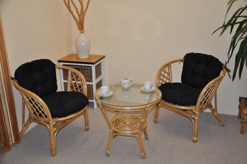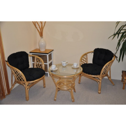 Sedací souprava Bahama patří stále mezi nejoblíbenější ratanové sedací soupravy. Souprava se skládá ze dvou křesel, stolku se skleněnou deskou a kompletní sady polstrů. | Barva ratanové konstrukce je medová. Materiál konstrukce je přírodní ratan. Rozměr křesla je 68x66x73 cm, výška sedu 44 cm, nosnost křesla je 110 kg. Stolek má výšku 55 cm, průměr stolku 60 cm. Spoje ratanové konstrukce jsou šroubovány. Polstry na tuto sedací soupravu Bahama jsou vyrobeny v České republice. Polstry jsou vyrobeny z kvalitní látky a vyznačují se vysokou kvalitou zpracování.Polstry pro nás vyrábí firma AXIN Cuschions s.r.o., která zaměstnávávýhradně místní vyučené švadleny z České republiky. Tímto způsobem sesnažíme podporovat výrobu a zaměstnanost v naší republice. Náplň polstrů je drcený molitan a polstry lze prát ručně na 40o C.