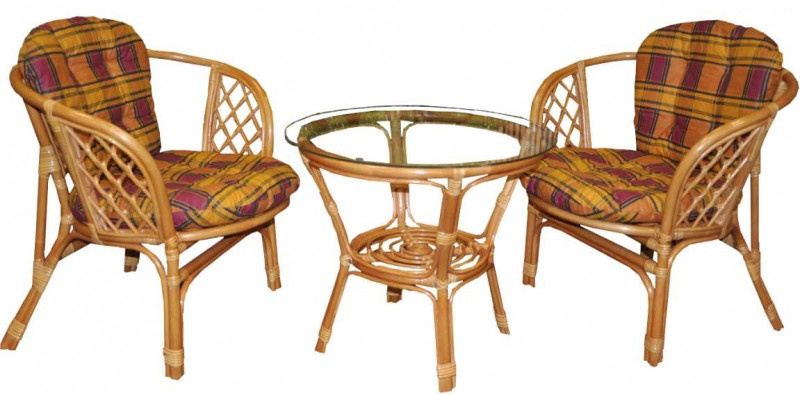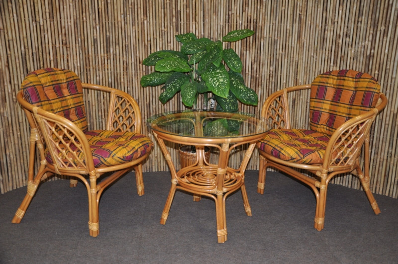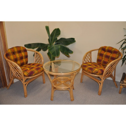 Sedací souprava Bahama patří stále mezi nejoblíbenější ratanové sedací soupravy. Souprava se skládá ze dvou křesel, stolku se skleněnou deskou a kompletní sady polstrů. | Barva ratanové konstrukce je medová. Materiál konstrukce je přírodní ratan. Rozměr křesla je 68x66x73 cm, výška sedu 44 cm, nosnost křesla je 110 kg. Stolek má výšku 55 cm, průměr stolku 65 cm. Spoje ratanové konstrukce jsou šroubovány. Polstry jsou vyrobeny v České republice a lze je prát ručně na 40oC nebo čistit v čistirně.