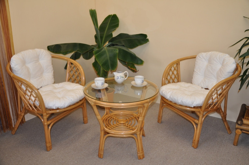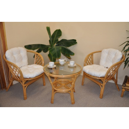 Sedací souprava Bahama patří stále mezi nejoblíbenější ratanové sedací soupravy. Souprava se skládá ze dvou křesel, stolku se skleněnou deskou a kompletní sady polstrů. | Barva ratanové konstrukce je medová. Materiál konstrukce je přírodní ratan. Rozměr křesla je 68x66x73 cm, výška sedu 44 cm, nosnost křesla je 110 kg. Stolek má výšku 55 cm, průměr stolku 65 cm. Spoje ratanové konstrukce jsou šroubovány. Polstry na tuto sedací soupravu jsou vyrobeny v České republice. Polstry jsouvyrobeny z kvalitní látky a vyznačují se vysokou kvalitou zpracování.Polstry pro nás vyrábí firma AXIN Cuschions s.r.o., která zaměstnávávýhradně místní vyučené švadleny z České republiky. Tímto způsobem sesnažíme podporovat výrobu a zaměstnanost v naší republice. Náplň polstrů je drcený molitan a polstry lze prát ručně na 40o C.