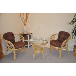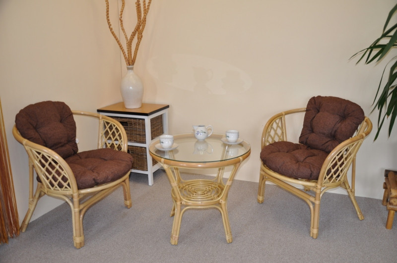Sedací souprava Bahama patří stále mezi nejoblíbenější ratanové sedací soupravy. Souprava se skládá ze dvou křesel, stolku se skleněnou deskou a kompletní sady polstrů. | Barva ratanové konstrukce je medová. Materiál konstrukce je přírodní ratan. Rozměr křesla je 68x66x73 cm, výška sedu 44 cm, nosnost křesla je 110 kg. Stolek má výšku 55 cm, průměr stolku 65 cm. Spoje ratanové konstrukce jsou šroubovány. Polstry na tuto sedací soupravu jsou vyrobeny v České republice. Polstry jsouvyrobeny z kvalitní látky a vyznačují se vysokou kvalitou zpracování.Polstry pro nás vyrábí firma AXIN Cuschions s.r.o., která zaměstnávávýhradně místní vyučené švadleny z České republiky. Tímto způsobem sesnažíme podporovat výrobu a zaměstnanost v naší republice. Náplň polstrů je drcený molitan a polstry lze prát ručně na 40o C.