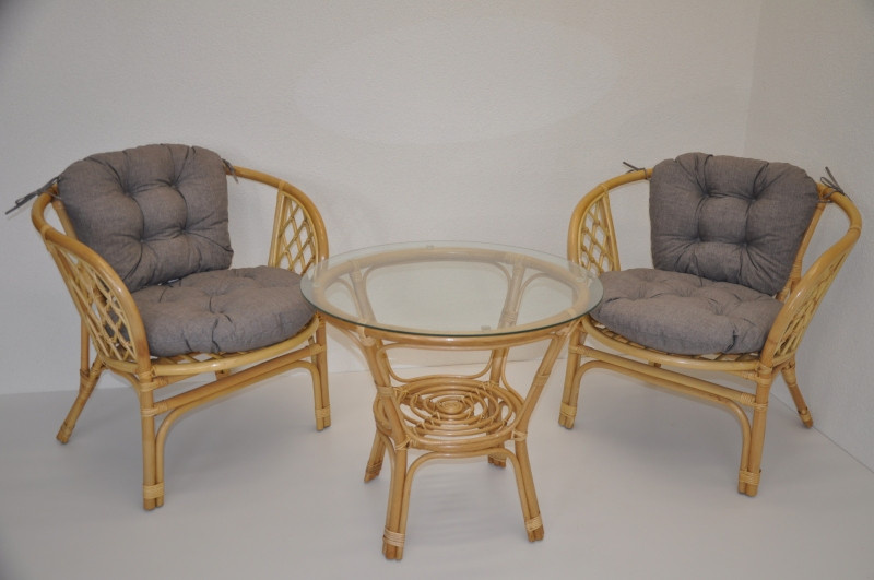 Sedací souprava Bahama patří stále mezi nejoblíbenější ratanové sedací soupravy. Souprava se skládá ze dvou křesel, stolku se skleněnou deskou a kompletní sady polstrů. | Barva ratanové konstrukce je medová. Materiál konstrukce je přírodní ratan. Rozměr křesla je 68x66x73 cm, výška sedu 44 cm, nosnost křesla je 110 kg. Stolek má výšku 55 cm, průměr stolku 65 cm. Spoje ratanové konstrukce jsou šroubovány. Polstry na tuto sedací soupravu jsou vyrobeny v České republice. Polstry jsouvyrobeny z kvalitní látky a vyznačují se vysokou kvalitou zpracování.Polstry pro nás vyrábí firma AXIN Cuschions s.r.o., která zaměstnávávýhradně místní vyučené švadleny z České republiky. Tímto způsobem sesnažíme podporovat výrobu a zaměstnanost v naší republice. Náplň polstrů je drcený molitan a polstry lze prát ručně na 40o C.