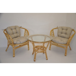 Sedací souprava Bahama patří stále mezi nejoblíbenější ratanové sedací soupravy. Souprava se skládá ze dvou křesel, stolku se skleněnou deskou a kompletní sady polstrů. | Barva ratanové konstrukce je medová. Materiál konstrukce je přírodní ratan. Rozměr křesla je 68x66x73 cm, výška sedu 44 cm, nosnost křesla je 110 kg. Stolek má výšku 55 cm, průměr stolku 60 cm. Spoje ratanové konstrukce jsou šroubovány. Polstry na tuto sedací soupravu jsou vyrobeny v České republice. Polstry jsouvyrobeny z kvalitní látky a vyznačují se vysokou kvalitou zpracování.Polstry pro nás vyrábí firma AXIN Cuschions s.r.o., která zaměstnávávýhradně místní vyučené švadleny z České republiky. Tímto způsobem sesnažíme podporovat výrobu a zaměstnanost v naší republice. Náplň polstrů je drcený molitan a polstry lze prát ručně na 40o C.