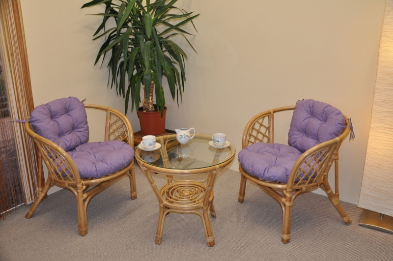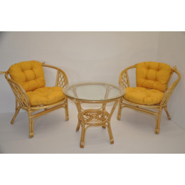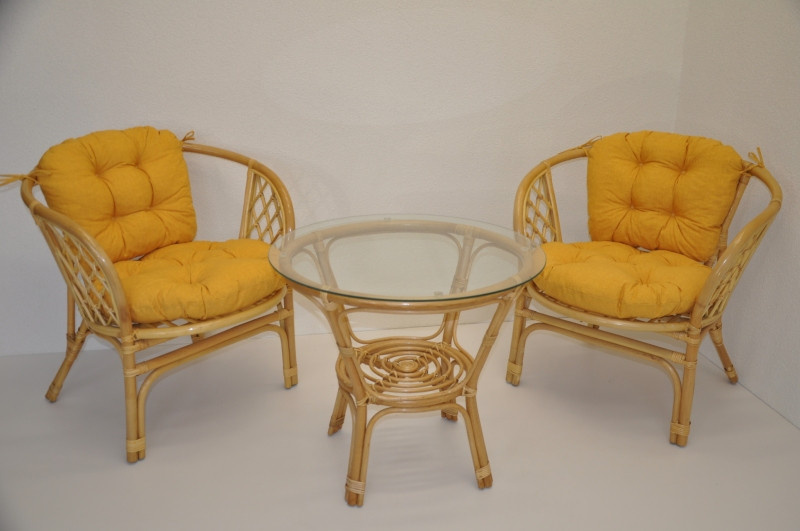 Sedací souprava Bahama patří stále mezi nejoblíbenější ratanové sedací soupravy. Souprava se skládá ze dvou křesel, stolku se skleněnou deskou a kompletní sady polstrů. | Barva ratanové konstrukce je medová. Materiál konstrukce je přírodní ratan. Rozměr křesla je 68x66x73 cm, výška sedu 44 cm, nosnost křesla je 110 kg. Stolek má výšku 55 cm, průměr stolku 65 cm. Spoje ratanové konstrukce jsou šroubovány. Polstry na tuto sedací soupravu jsou vyrobeny v České republice. Polstry jsouvyrobeny z kvalitní látky a vyznačují se vysokou kvalitou zpracování.Polstry pro nás vyrábí firma AXIN Cuschions s.r.o., která zaměstnávávýhradně místní vyučené švadleny z České republiky. Tímto způsobem sesnažíme podporovat výrobu a zaměstnanost v naší republice. Náplň polstrů je drcený molitan a polstry lze prát ručně na 40o C.