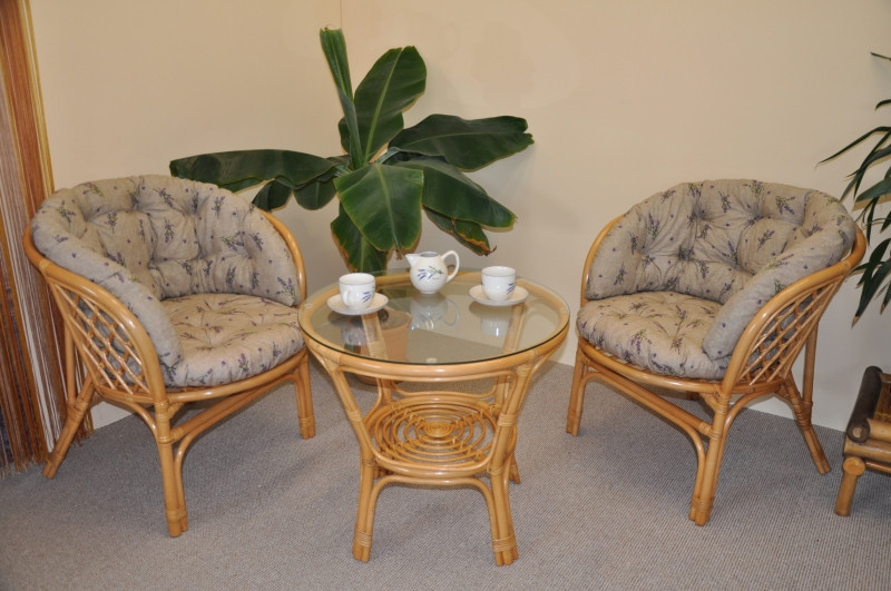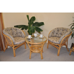 Ratanová sedací souprava Bahama se skládá ze dvou křesel, stolku se skleněnou deskou a kompletní sady polstrů v MAXI provedení. | Barva ratanové konstrukce je medová. Materiál konstrukce je přírodní ratan. Rozměr křesla je 68x66x73 cm, výška sedu 44 cm, nosnost křesla je 110 kg. Stolek má výšku 55 cm, průměr stolku 65 cm. Spoje ratanové konstrukce jsou šroubovány. Polstry na tuto sedací soupravu Bahama jsou vyrobeny v České republice. Polstry jsou vyrobeny z kvalitní látky a vyznačují se vysokou kvalitou zpracování.Polstry pro nás vyrábí firma AXIN Cuschions s.r.o., která zaměstnávávýhradně místní vyučené švadleny z České republiky. Tímto způsobem sesnažíme podporovat výrobu a zaměstnanost v naší republice. Náplň polstrů je drcený molitan a polstry lze prát ručně na 40o C.