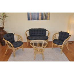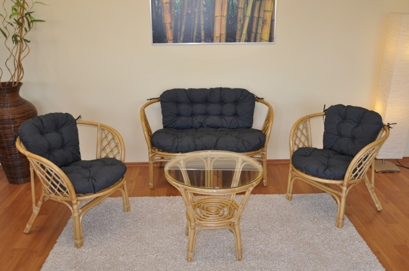 Ratanový nábytek - ratanová sedací souprava Bahama je vyrobena z přírodního ratanu s barvou konstrukce v medovém odstínu. Souprava obsahuje pohovku, 2 křesla, stolek se sklem a kompletní sadu velice kvalitních polstrů. | Barva ratanové konstrukce i ratanového výpletu je medová. Velikost pohovky je 115x66x73 cm, nosnost pohovky je 150 kg. Velikost křesla je 68x66x73 cm, nosnost křesla je 110 kg. Výška sedu je 44 cm. Stolek má výšku 55 cm, průměr stolku je 60 cm. Spoje ratanové konstrukce jsou šroubovány. Polstry na tuto sedací soupravu Bahama jsou vyrobeny v České republice. Polstry jsou vyrobeny z kvalitní látky a vyznačují se vysokou kvalitou zpracování.Polstry pro nás vyrábí firma AXIN Cuschions s.r.o., která zaměstnávávýhradně místní vyučené švadleny z České republiky. Tímto způsobem sesnažíme podporovat výrobu a zaměstnanost v naší republice.Náplň polstrů je drcený molitan a polstry lze prát ručně na 40o C.