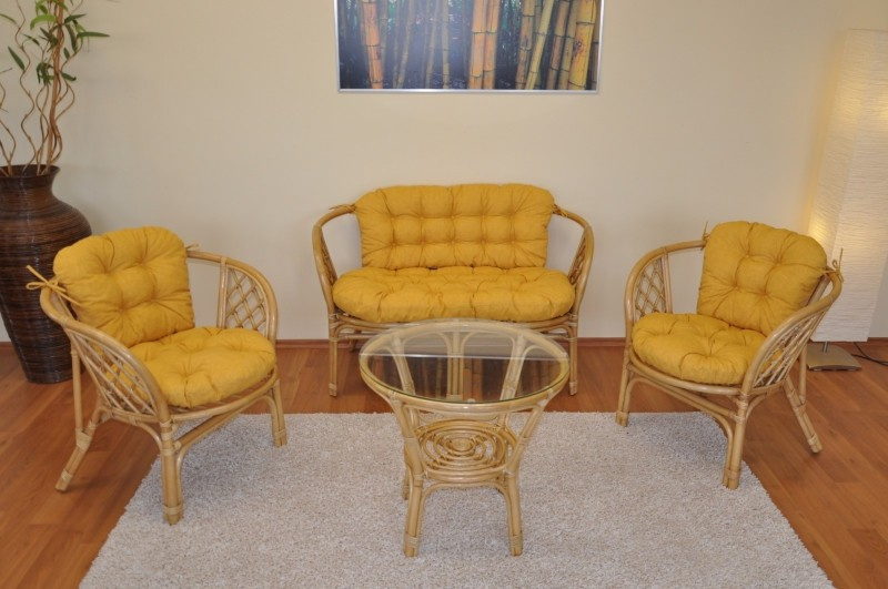 Ratanový nábytek - ratanová sedací souprava Bahama je vyrobena z přírodního ratanu s barvou konstrukce v medovém odstínu. Souprava obsahuje pohovku, 2 křesla, stolek se sklem a kompletní sadu velice kvalitních polstrů. | Barva ratanové konstrukce i ratanového výpletu je medová. Velikost pohovky je 115x66x73 cm, nosnost pohovky je 150 kg. Velikost křesla je 68x66x73 cm, nosnost křesla je 110 kg. Výška sedu je 44 cm. Stolek má výšku 55 cm, průměr stolku je 60 cm. Spoje ratanové konstrukce jsou šroubovány. Polstry na tuto sedací soupravu Bahama jsou vyrobeny v České republice. Polstry jsou vyrobeny z kvalitní látky a vyznačují se vysokou kvalitou zpracování.Polstry pro nás vyrábí firma AXIN Cuschions s.r.o., která zaměstnávávýhradně místní vyučené švadleny z České republiky. Tímto způsobem sesnažíme podporovat výrobu a zaměstnanost v naší republice.Náplň polstrů je drcený molitan a polstry lze prát ručně na 40o C.