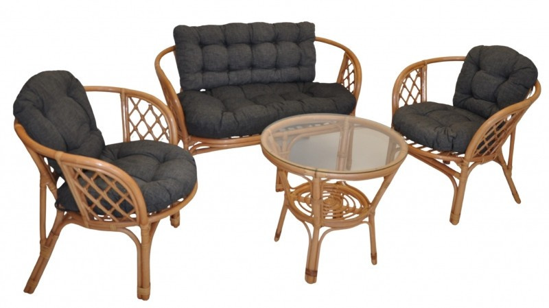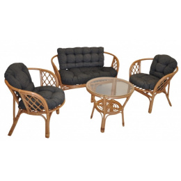 Ratanový nábytek - ratanová sedací souprava Bahama je vyrobena z přírodního ratanu s barvou konstrukce v tmavě medovém odstínu. Souprava obsahuje pohovku, 2 křesla, stolek se sklem a kompletní sadu polstrů. | Barva ratanové konstrukce i ratanového výpletu je tmavý med. Velikost pohovky je 115x66x73 cm, nosnost pohovky je 150 kg. Velikost křesla je 68x66x73 cm, nosnost křesla je 110 kg. Výška sedu je 44 cm. Stolek má výšku 55 cm, průměr stolku je 60 cm. Náplň polstrů je drcený molitan a polstry lze prát ručně na 40o C.