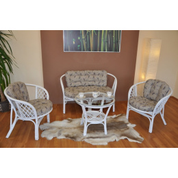 Ratanový nábytek - ratanová sedací souprava je vyrobena z přírodního ratanu s barvou konstrukce odpovádající fotografii výrobku,obsahuje lavici,2 křesla a stolek se sklem, kompletní sadu polstrů vyrobených v České republice. | Barva ratanové konstrukce je bílá. Hlavní spoje ratanové konstrukce jsou šroubovány. Rozměr lavice 115x66x73 cm, nosnost lavice 150 kg. Rozměr křesla 68x66x73 cm, nosnost křesla 110 kg. Výška sedu je příjemných 44 cm. Stolek výška 55 cm, průměr stolku 65 cm. Polstry na tuto sedací soupravu Bahama jsou vyrobeny v České republice. Polstry jsou vyrobeny z kvalitní látky a vyznačují se vysokou kvalitou zpracování.Polstry pro nás vyrábí firma AXIN Cuschions s.r.o., která zaměstnávávýhradně místní vyučené švadleny z České republiky. Tímto způsobem sesnažíme podporovat výrobu a zaměstnanost v naší republice.Náplň polstrů je drcený molitan a polstry lze prát ručně na 40o C.