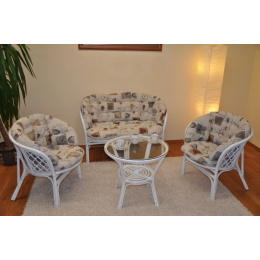 Ratanový nábytek - ratanová sedací souprava je vyrobena z přírodního ratanu s barvou konstrukce odpovádající fotografii výrobku,obsahuje lavici,2 křesla a stolek se sklem, kompletní sadu polstrů v MAXI provedení vyrobených v České republice. | Barva ratanové konstrukce je bílá. Hlavní spoje ratanové konstrukce jsou šroubovány. Rozměr lavice 115x66x73 cm, nosnost lavice 150 kg. Rozměr křesla 68x66x73 cm, nosnost křesla 110 kg. Výška sedu je příjemných 44 cm. Stolek výška 55 cm, průměr stolku 65 cm. Polstry na tuto sedací soupravu Bahama jsou vyrobeny v České republice. Polstry jsou vyrobeny z kvalitní látky a vyznačují se vysokou kvalitou zpracování.Polstry pro nás vyrábí firma AXIN Cuschions s.r.o., která zaměstnávávýhradně místní vyučené švadleny z České republiky. Tímto způsobem sesnažíme podporovat výrobu a zaměstnanost v naší republice.Náplň polstrů je drcený molitan a polstry lze prát ručně na 40o C.