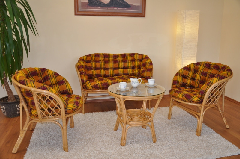 Ratanový nábytek - ratanová sedací souprava Bahama je vyrobena z přírodního ratanu s barvou konstrukce v medovém odstínu. Souprava obsahuje pohovku, 2 křesla, stolek se sklem a kompletní sadu polstrů vyrobených v České republice. | Barva ratanové konstrukce i ratanového výpletu je medová. Velikost pohovky je 115x66x73 cm, nosnost pohovky je 150 kg. Velikost křesla je 68x66x73 cm, nosnost křesla je 110 kg. Výška sedu je 44 cm. Stolek má výšku 55 cm, průměr stolku je 60 cm. Spoje ratanové konstrukce jsou šroubovány. Polstry lze prát ručně na 40oC nebo čistit v čistirně