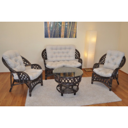 Krásná ratanová sedací souprava sestávající se ze dvou křesel, lavice a velkého kulatého stolku se skleněnou deskou. Křesla i lavice jsou velice prostorné a příjemně překvapí měkké naducané polstry. | Barva ratanové konstrukce je hnědá. Hlavní konstrukce je vyrobena ze zdvojených ratanových tyčí pro dosažení vysoké kvality a pevnosti sedací soupravy. Velikost pohovky je 133x80x90 cm, nosnost pohovky je 220 kg Velikost křesla je 73x80x90 cm, nosnost 140 kg. Výška sedu je 43 cm včetně polstru. Velikost stolku se skleněnou deskou je: průměr 70cm, výška 55 cm.