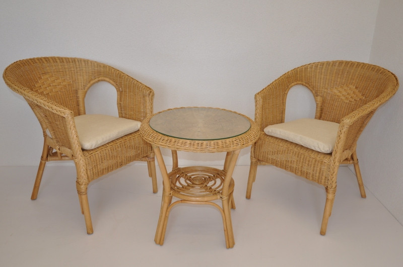Ratanový nábytek - ratanová sedací souprava je vyrobena z přírodního ratanu v medové barvě konstrukce. | Masivní ratanová konstrukce s ratanovým výpletem z proutků průměr 3 mm. Barva ratanové konstrukce i výpletu je medová. Rozměr křesla je 58x57x76 cm, nosnost křesla 110 kg Stolek se sklem průměr 55 cm, výška stolku je 55 cm Polstry jsou vyrobeny v České republice. Spoje ratanové konstrukce jsou šroubovány.