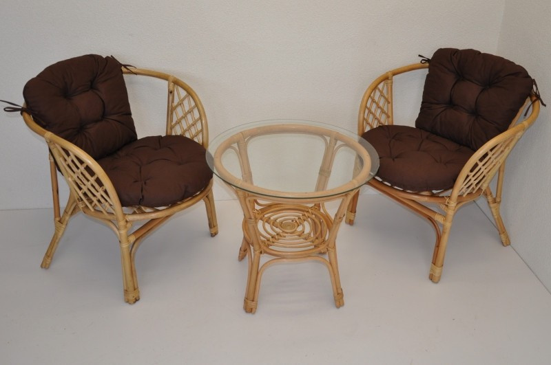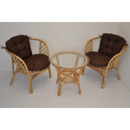 Ratanová sedací souprava Jawa vychází konstrukčně z velice oblíbené sedací soupravy Bahama. Sedací soupravu prodáváme jako celek 2 křesílka, stolek se sklem a sadu polstrů. | Sedací souprava je vyrobena z přírodního ratanu. Barva ratanové konstrukce i výpletu je medová. Velikost křesla 67x65x72 cm, nosnost křesla je 110 kg, výška sedu je 42 cm. Průměr skleněné desky stolku je 60 cm, výška stolku je 56 cm. Polstry jsou vyrobeny v Indonesii.