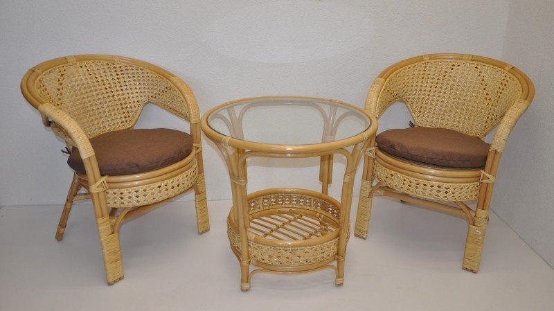 Ratanový nábytek - ratanová sedací souprava je vyrobena z přírodního ratanu s barvou konstrukce odpovádající fotografii výrobku,obsahuje 2 křesla a stolek se sklem a sadu polstrů. | Barva ratanové konstrukce i ratanového výpletu je medová. Velikost křesla je 66x67x78 cm. Nosnost křesla 115kg. Stolek výška 60 cm, průměr stolku 65 cm. Spoje ratanové konstrukce jsou šroubovány. Polstry jsou vyrobeny v České republice.