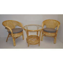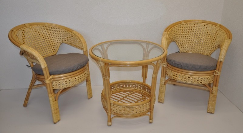 Ratanový nábytek - ratanová sedací souprava je vyrobena z přírodního ratanu s barvou konstrukce odpovádající fotografii výrobku,obsahuje 2 křesla a stolek se sklem a sadu polstrů. | Barva ratanové konstrukce i ratanového výpletu je medová. Velikost křesla je 66x67x78 cm. Nosnost křesla 115kg. Stolek výška 60 cm, průměr stolku 65 cm. Spoje ratanové konstrukce jsou šroubovány. Polstry jsou vyrobeny v České republice.
