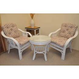 Ratanová sedací souprava je vyrobena z přírodního ratanu z masivních ratanových tyčí. Součástí soupravy jsou 2 křesla, stolek a sada polstrů. | Konstrukce ratanové sedací soupravy je na většině míst trojitá a tím velice pevná. Křesla jsou velice pohodlná díky rozložitému tvaru a kvalitním polštářům. Barva ratanové kontrukce a výpletu je bílá. Velikost křesla je 68x75x74 cm, nosnost křesla je 125 kg. Výška sedu je 44 cm. Stolek má průměr 55 cm a je 55 cm vysoký.