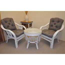 Ratanová sedací souprava je vyrobena z přírodního ratanu z masivních ratanových tyčí. Součástí soupravy jsou 2 křesla, stolek a sada polstrů. | Konstrukce ratanové sedací soupravy je na většině míst trojitá a tím velice pevná. Křesla jsou velice pohodlná díky rozložitému tvaru a kvalitním polštářům. Barva ratanové kontrukce a výpletu je bílá. Velikost křesla je 68x75x74 cm, nosnost křesla je 125 kg. Výška sedu je 44 cm. Stolek má průměr 55 cm a je 55 cm vysoký.