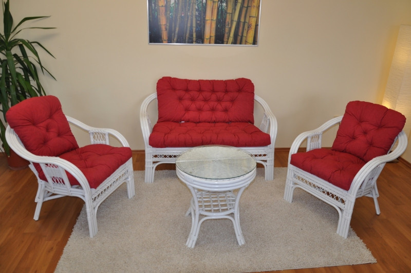 Ratanová sedací souprava je vyrobena z přírodního ratanu z masivních ratanových tyčí. Součástí soupravy je pohovka, 2 křesla, stolek a sada polstrů. | Konstrukce ratanové sedací soupravy je na většině míst trojitá a tím velice pevná. Křesla a pohovka jsou velice pohodlné díky rozložitému tvaru a kvalitním polštářům. Barva ratanové kontrukce a výpletu je bílá. Velikost pohovky je 118x75x74 cm, nosnost 180 kg. Velikost křesla je 68x75x74 cm, nosnost křesla je 125 kg. Výška sedu je 44 cm. Stolek má průměr 55 cm a je 55 cm vysoký.