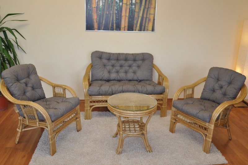 Ratanová sedací souprava je vyrobena z přírodního ratanu z masivních ratanových tyčí. Součástí soupravy je pohovka, 2 křesla, stolek a sada polstrů. | Konstrukce ratanové sedací soupravy je na většině míst trojitá a tím velice pevná. Křesla a pohovka jsou velice pohodlné díky rozložitému tvaru a kvalitním polštářům. Barva ratanové kontrukce a výpletu je medová. Velikost pohovky je 118x75x74 cm, nosnost 180 kg. Velikost křesla je 68x75x74 cm, nosnost křesla je 125 kg. Výška sedu je 44 cm. Stolek má průměr 55 cm a je 55 cm vysoký.