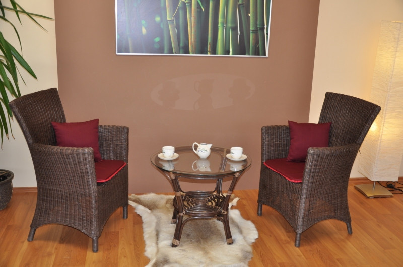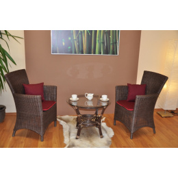 Ratanová sedací souprava sestávající se ze dvou velice pohodlných křesel a stolu vyrobených z přírodního ratanu. Spoje ratanové konstrukce jsou šroubovány. Polstry k soupravě jsou vyrobeny v České republice. | Velikost křesla 63x56x94 cm. Nosnost křesla 120 kg. Stolek se sklem průměr 65 cm. Barva ratanové konstrukce i výpletu je hnědá. Polstry jsou pratelné na 40oC. >