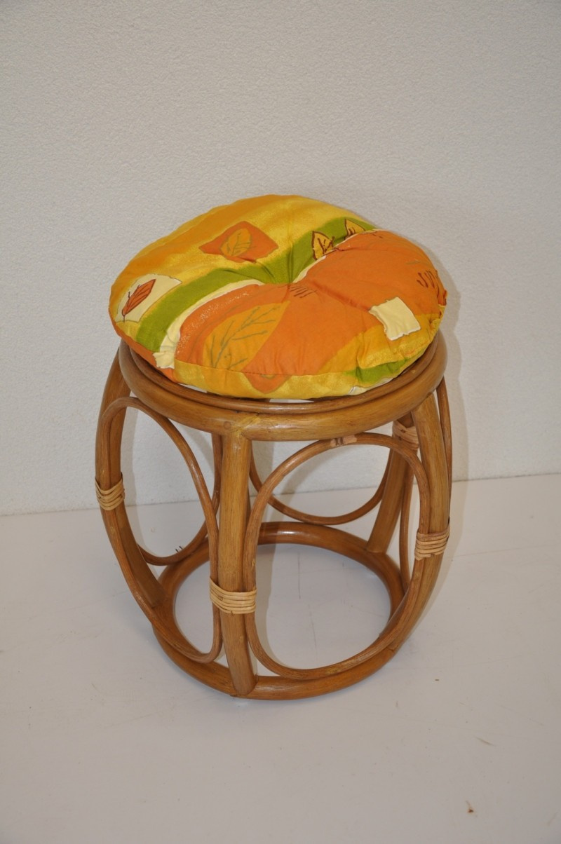 Ratanový nábytek - ratanová taburetka s polstrem | Průměr 35 cm, výška 38 cm. Nosnost taburetky je 110 kg. Barva ratanové konstrukce je medová. Polstr je vyrobený v České republice a je pratelný na 40oC. Materiál polstru je 100% bavlna, výplň polstru je drcený molitan.