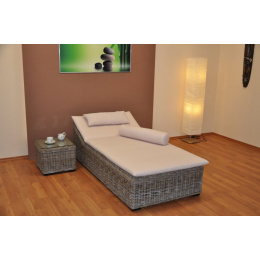 Luxusní ratanové lehátko z přírodního ratanu kubu. Konstrukce lehátka je vyrobena z masivního teakového dřeva. | Výplet lehátka je tvořen ratanam kubu v přírodní šedé barvě. ratan kubu se vyznačuje vysokou odolností a pevností. Součástí je i odkládácí stolek o velikosti 45x45x45 cm se skleněnou deskou. Barva ratanového výpletu je přírodní šedá. Velikost lehátka je 180x90x50 cm Nosnost lehátka je 160 kg Barva polstru je bílá.
