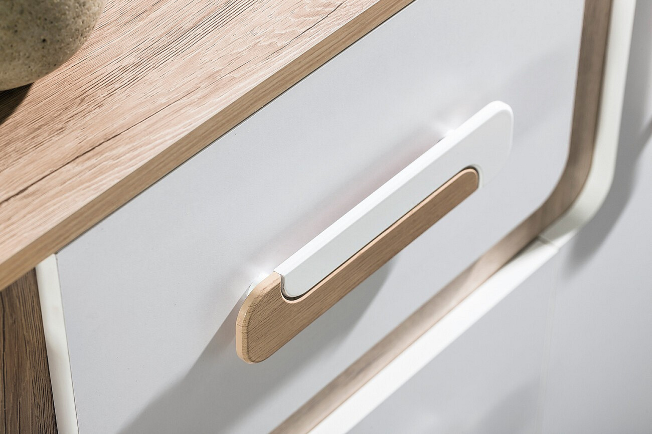 Nábytek APETITO je vyroben z kvalitního lamina o tloušťce 16 mm, což zajišťuje jeho pevnost a dlouhou životnost. Povrchová úprava v kombinaci dubu a bílé barvy dodává skříni moderní a svěží vzhled, který se snadno hodí do jakéhokoli interiéru.