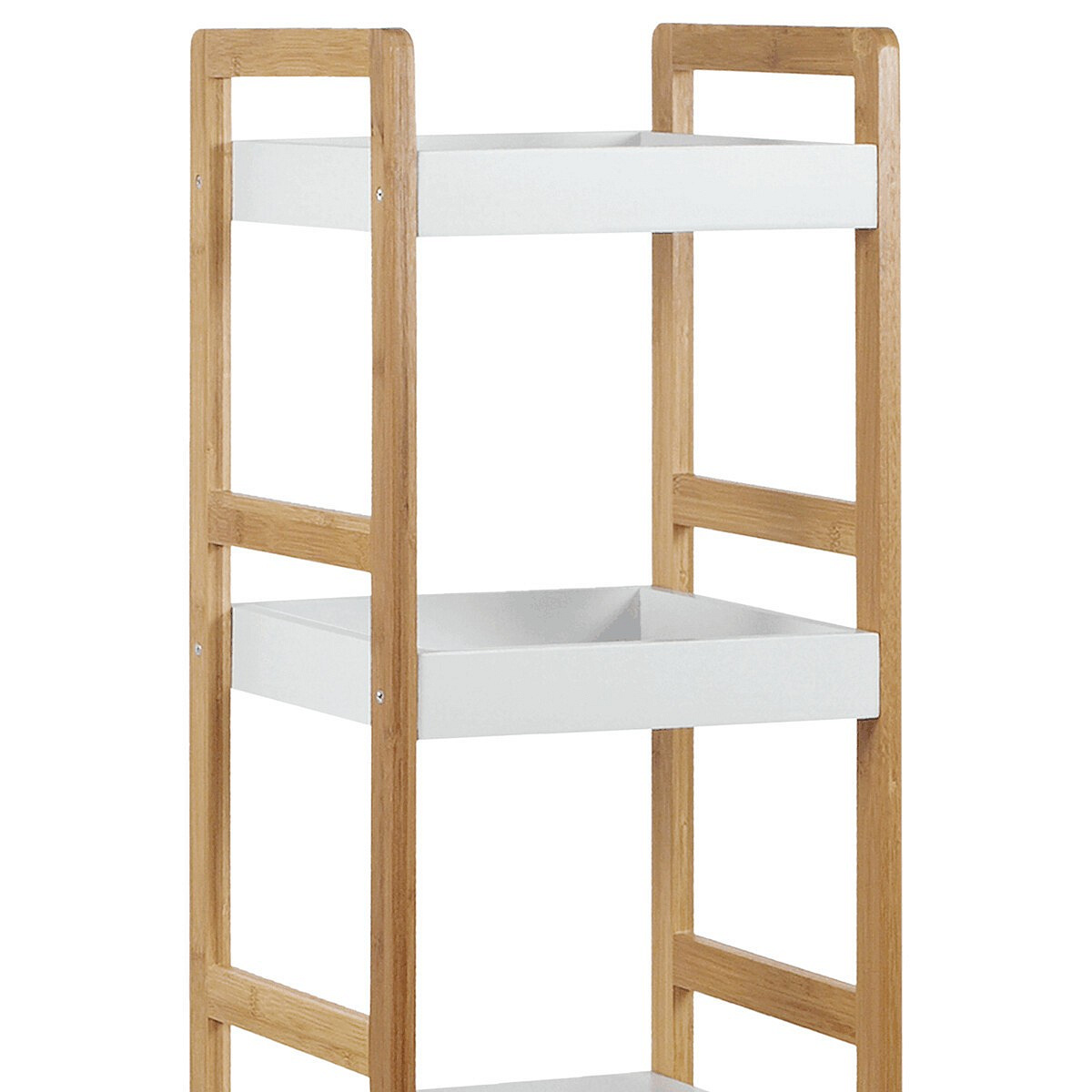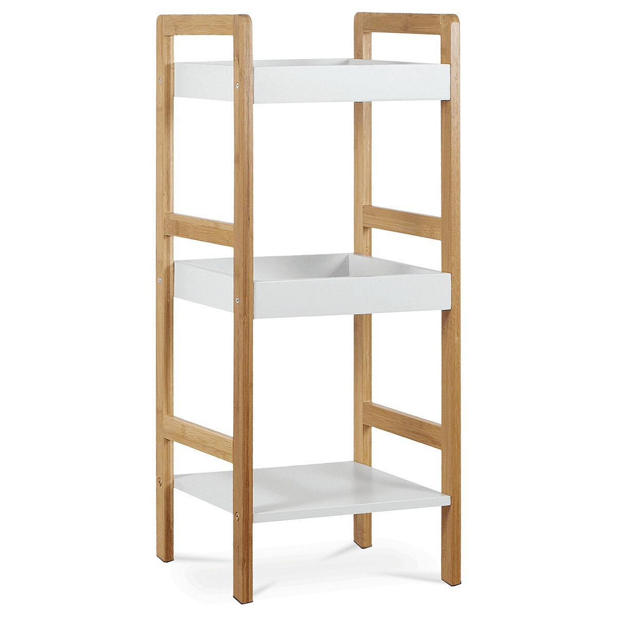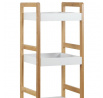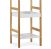 Regál s třemi policemi kombinuje pevnost masivního bambusu s bílým matným lakem MDF desek, což vytváří stabilní a zároveň esteticky příjemný kus nábytku. Bambusové bočnice v přírodním odstínu dodávají regálu přirozený vzhled a zajišťují pevnou oporu pro jednotlivé police. Dvě horní police jsou opatřeny zvýšenými okraji, které zabraňují sklouznutí uložených předmětů, zatímco spodní police je plochá a nabízí další úložný prostor. Díky nosnosti 9 kg na polici je regál vhodný pro lehčí dekorace, knihy či drobné předměty v interiéru. Kompaktní rozměry a jednoduchý design umožňují snadné umístění do různých prostorů, kde oceníte kombinaci funkčnosti a přírodního stylu.