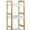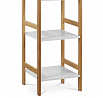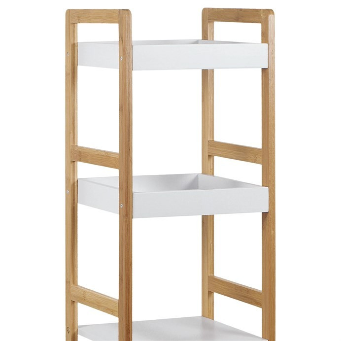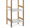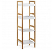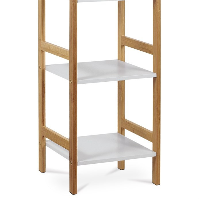 Regál s čtyřmi policemi kombinuje pevný rám z masivního bambusu v přírodním odstínu s policemi z MDF desek opatřených bílým matným lakem. Tento materiálový mix zajišťuje stabilitu a zároveň moderní vzhled vhodný do různých interiérů. Police jsou navrženy tak, aby unesly zatížení až 12 kg, což umožňuje bezpečné uložení dekorací, knih nebo drobných předmětů. Otevřená konstrukce regálu podporuje snadný přístup a přehlednost uložených věcí. Kompaktní rozměry a decentní barevné provedení umožňují univerzální využití v domácnostech i kancelářích.