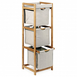 Multifunkční regál se třemi zásuvkami / boxy. Nosná konstrukce je vyrobena z masivního bambusu, lakovaného kvalitním trasparentním lakem. Bambus jako takový opdpuzuje vodu a touto povrchovou úpravou dosahuje velmi dobré voděodolnosti. Výsuvné boxy jsou vyrobeny ze středně hrubé látky v šedém odstínu se závěsným rámem z bambusu.Regál vhodný do koupelen, ale i do předsíní či místností, kde upotřebíte úložné prostory.Látkové boxy jsou prodyšné, jejich nosnost je až 3 kg, celková 9 kg. Ideálně regál k plné spokojenosti využijete k uložení ručníků, osušek nebo i části oblečení, popř. dalších věcí, dle potřeby.