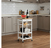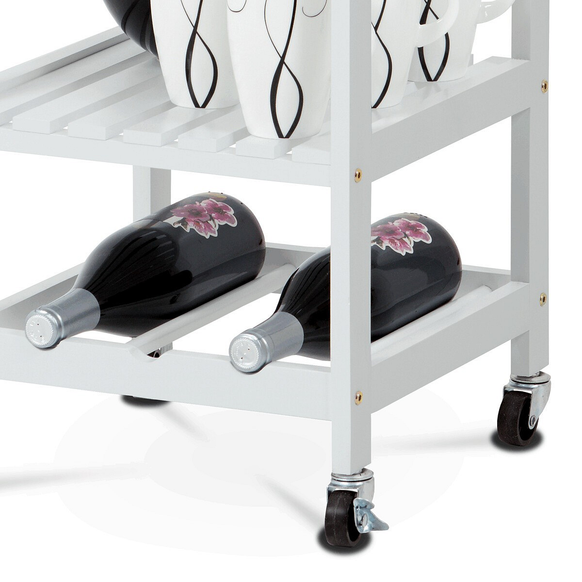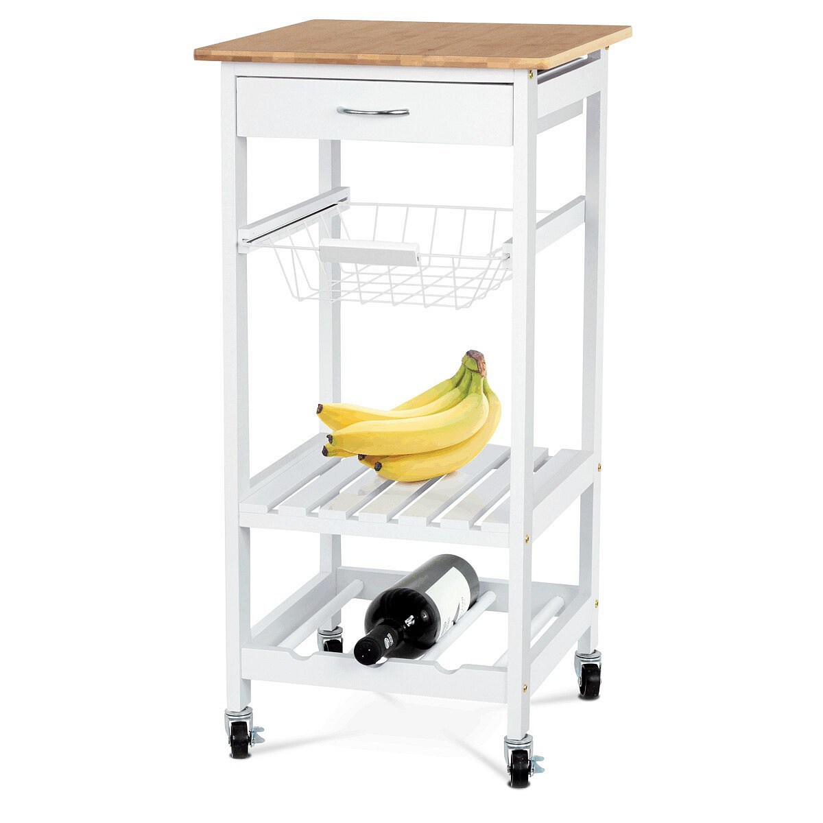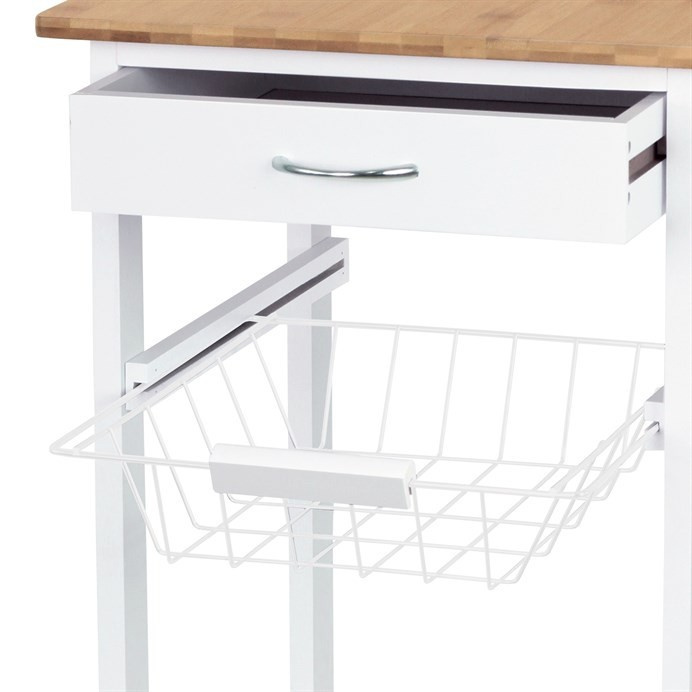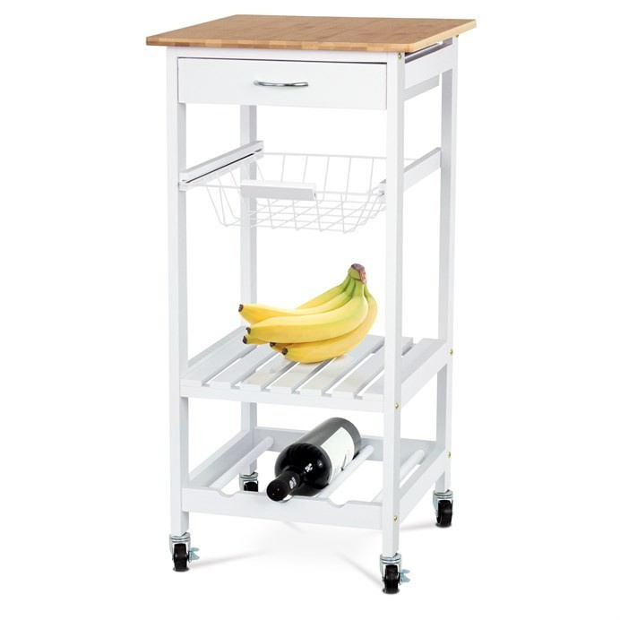 Servírovací stolek a regál DR-044 kombinuje přírodní masiv bambusové desky s bílým matným lakem na MDF nohou, což zajišťuje pevné a stabilní provedení vhodné do moderních i klasických interiérů. Vrchní deska z bambusu nabízí odolný a snadno udržovatelný povrch ideální pro přípravu a servírování jídel. Stolek je vybaven praktickou zásuvkou s kovovou úchytkou pro uložení drobných předmětů, drátěným košíkem pro snadný přístup k potravinám a dvěma policemi, které umožňují efektivní uspořádání nádobí či lahví. Pojezdová kolečka s brzdou zajišťují snadnou mobilitu a stabilitu při použití. Kompaktní rozměry a funkční design přinášejí do kuchyně nebo jídelny praktické řešení pro organizaci a servírování.