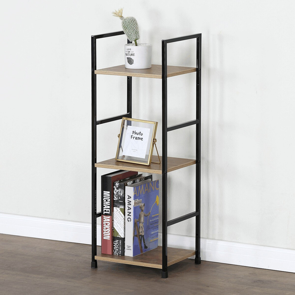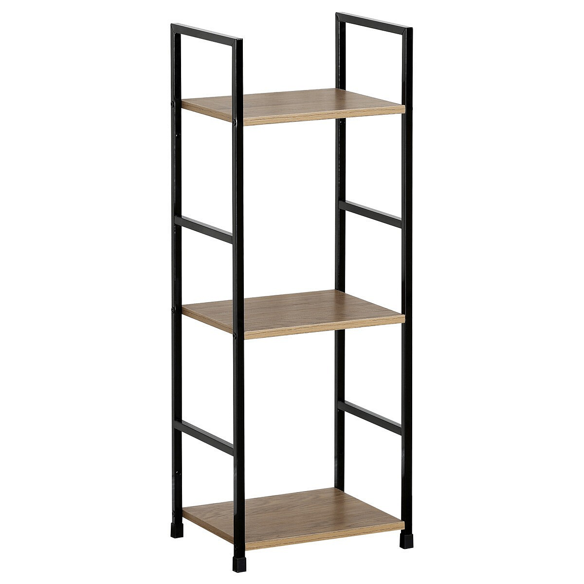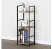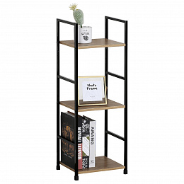 Odlehčený policový regál. Kostra vyrobena z kovových hranatých profilů černé barvy. Na police je použita MDF deska s povrchovou úpravou 3D folie v textuře dubu. Balení obsahuje sadu umožňující připevnění ke stěně.