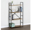 Regál s čtyřmi policemi nabízí dostatek odkládacího prostoru pro knihy, dekorace či úložné boxy. Police jsou vyrobeny z MDF desek s dekorem dubu, které doplňuje pevná kovová konstrukce v černém laku, jež zajišťuje stabilitu a dlouhou životnost. Otevřený design regálu umožňuje snadný přístup ke všem položkám a zároveň působí vzdušně v interiéru. Kovové rámy po stranách jsou doplněny o diagonální výztuhu pro zvýšení pevnosti. Díky kombinaci přírodního dekoru a industriálního kovu se regál hodí do moderních i rustikálních prostor.