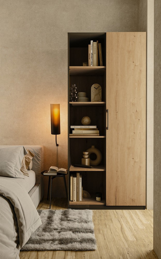 Nadčasová knihovna Ridas v minimalistickém designu je praktický kus nábytku, který si najde své místo jak v obývacím pokoji, tak i v kanceláři nebo ateliéru. Knihovna je vyrobena z nejkvalitnější laminované desky odolné proti poškrábání a vlhkosti, hrany jsou povrchově upraveny ABS.
