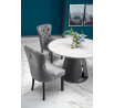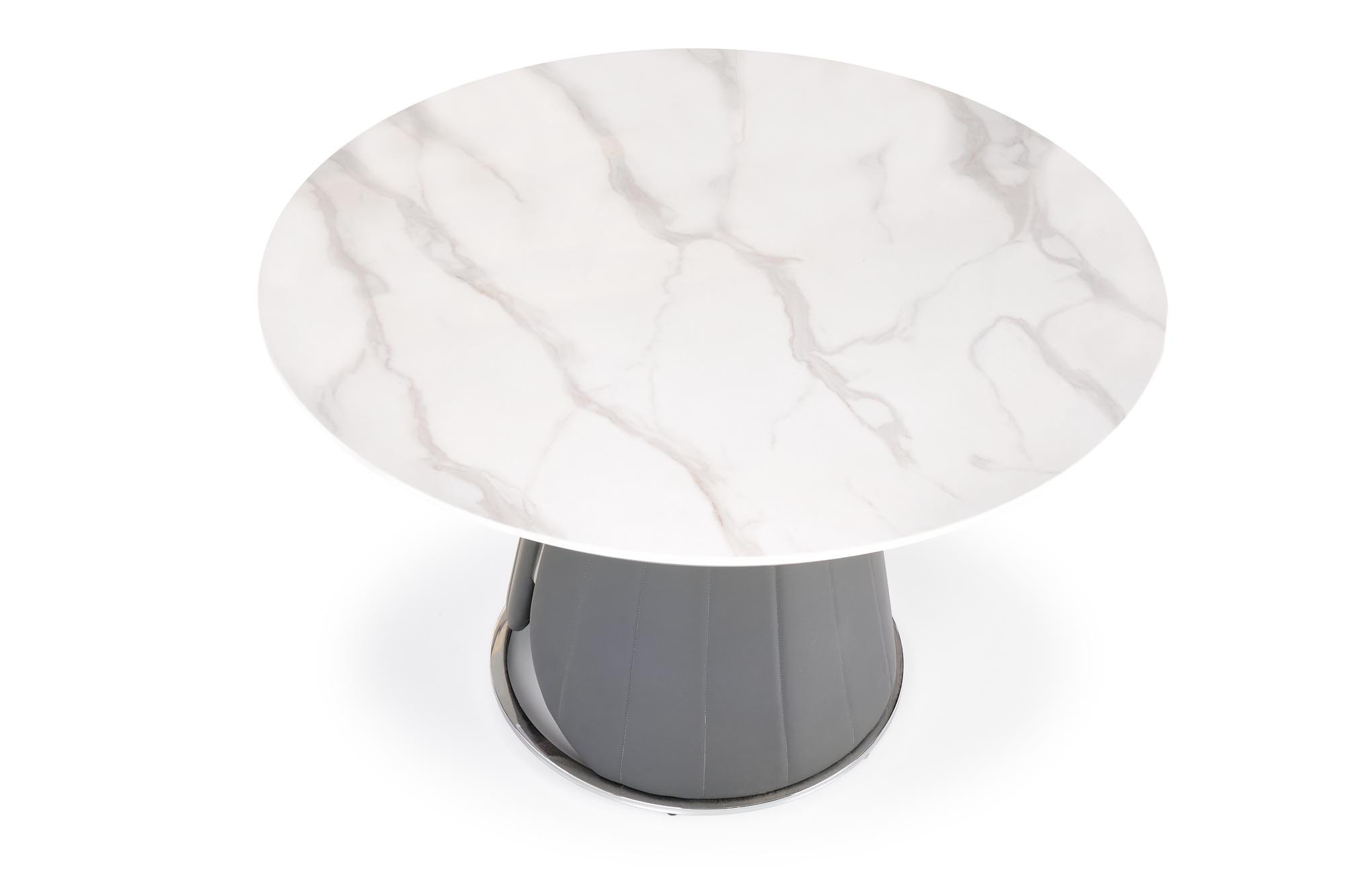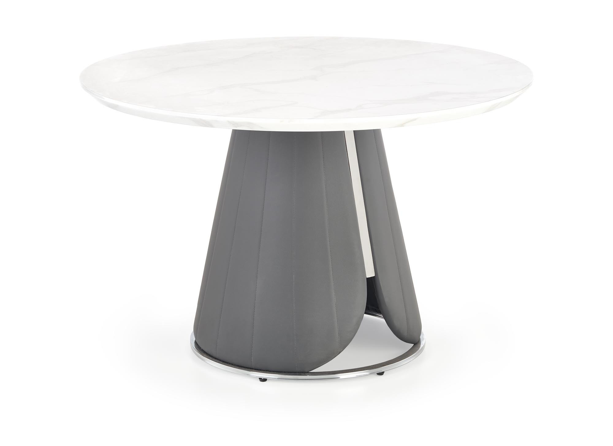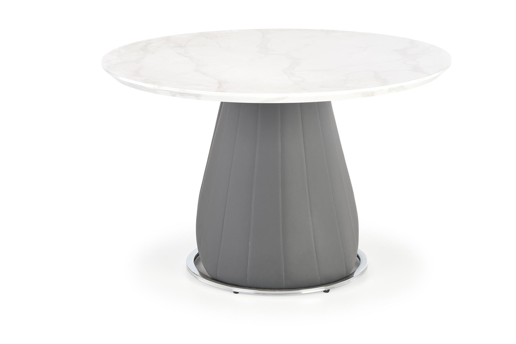 méretek: fi120/77 cm, anyag: MDF furnér / krómozott acél / ökobőr, szín: felső lap - fehér márvány, láb - szürke