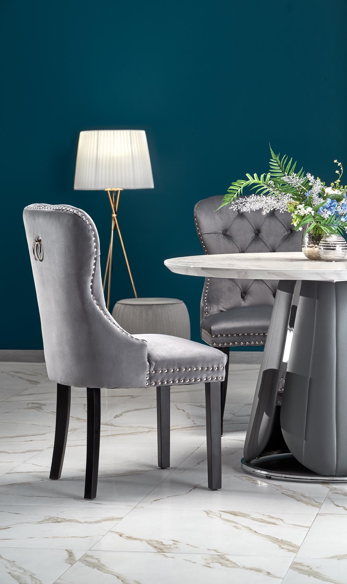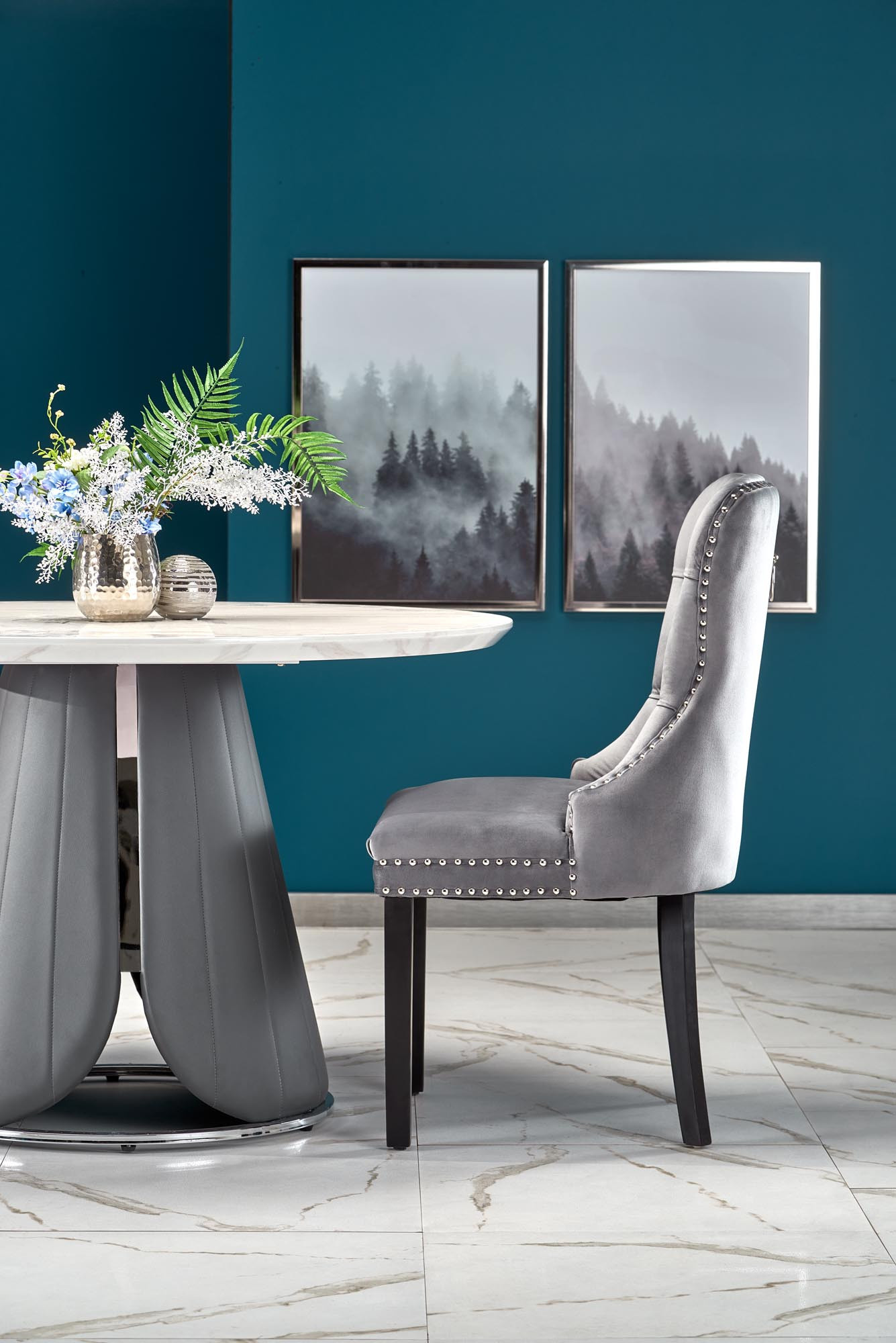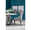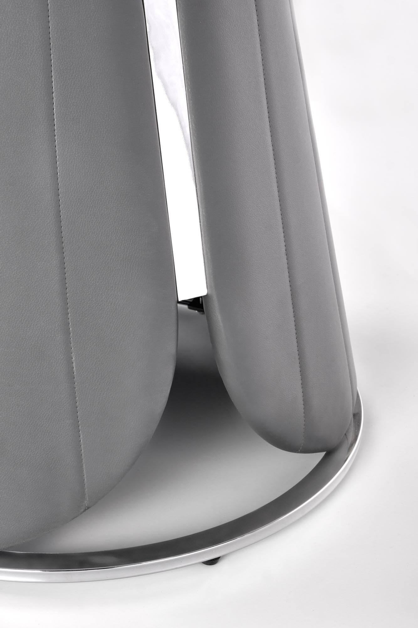 méretek: fi120/77 cm, anyag: MDF furnér / krómozott acél / ökobőr, szín: felső lap - fehér márvány, láb - szürke