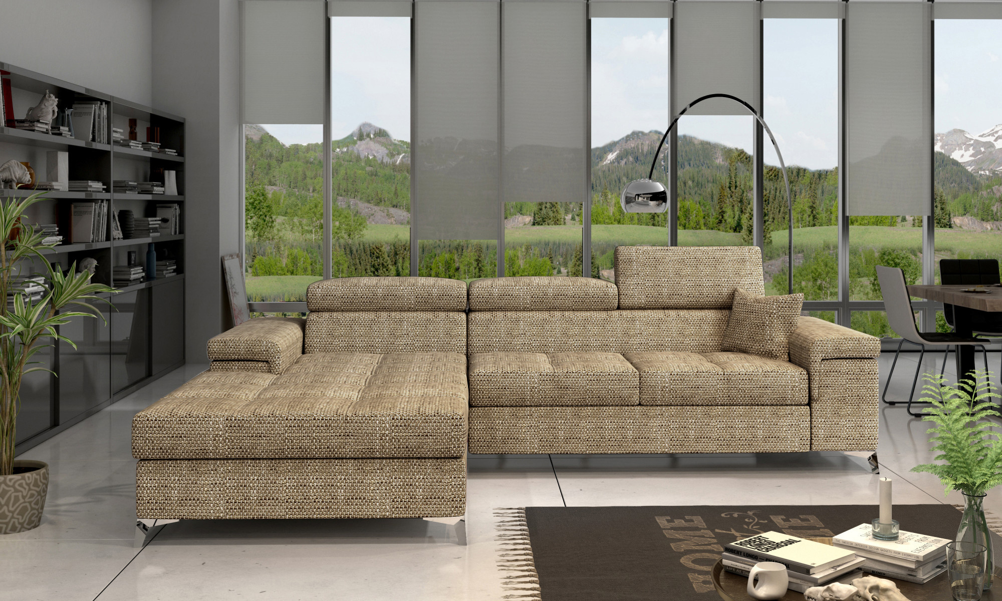 Ricardo is a simple and stylish corner sofa with thoughtful embellishments in the modern classic style, as the classic body is complemented by many, modern finishes of individual elements. The spacious corner sofa, measuring 280 x 205 x 90 cm, will be perfect as a piece of furniture for daytime relaxation, but it can also serve as a place to sleep, measuring 125 x 210 cm. This model is equipped with a folding sleeping function, based on the simple and intuitive to use dolphin system. Besides, it also has a spacious bedding container located in the ottoman. The effect of softness and springiness is due to the use of high-quality foam in it and the use of corrugated springs. The comfortable seat, wide armrests, adjustable headrests and chrome legs deserve an additional distinction in our furniture. In addition, this model, is available in the full range of Eltap colors. We guarantee that from such a corner sofa as Ricardo - you will be 101% satisfied.