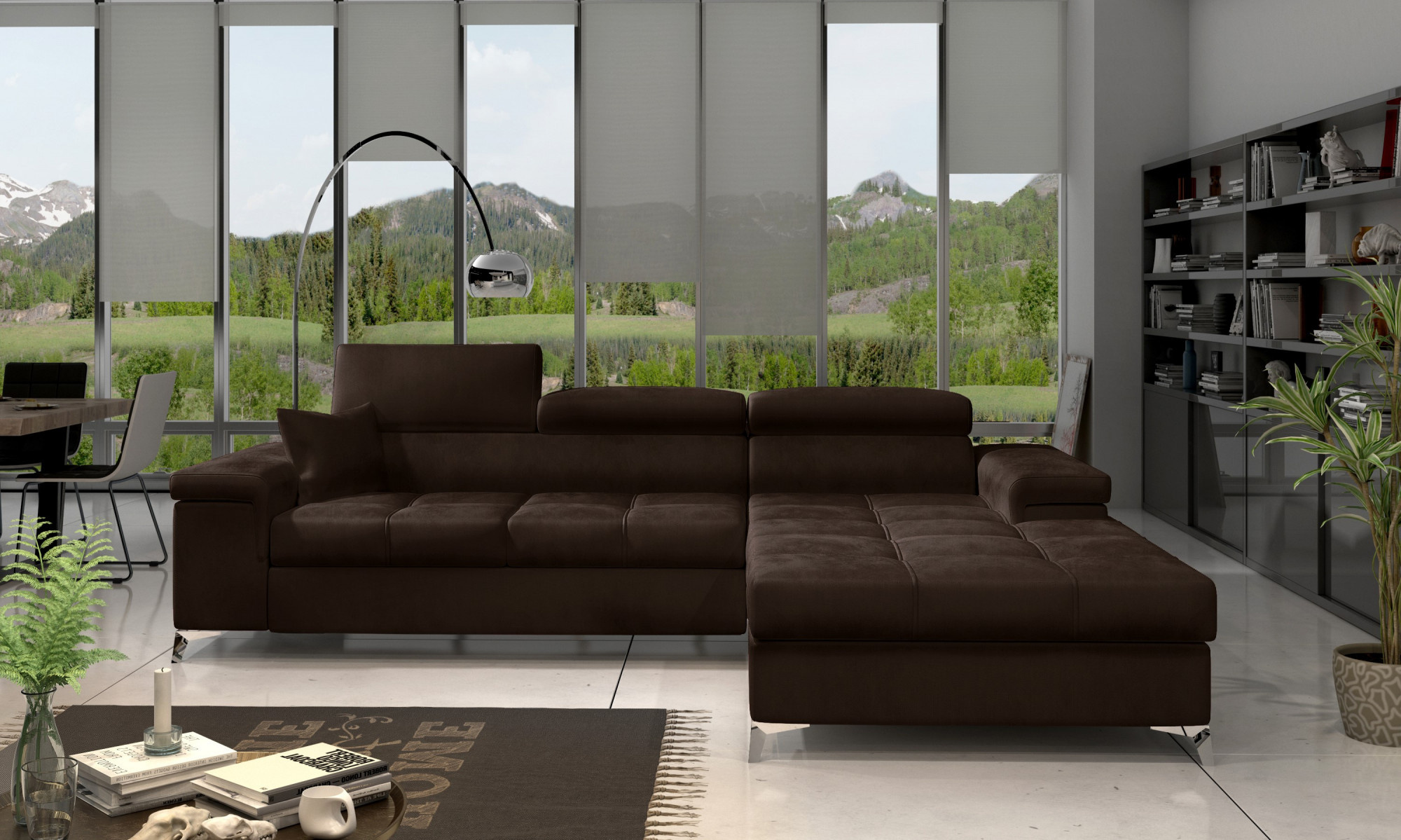 Ricardo is a simple and stylish corner sofa with thoughtful embellishments in the modern classic style, as the classic body is complemented by many, modern finishes of individual elements. The spacious corner sofa, measuring 280 x 205 x 90 cm, will be perfect as a piece of furniture for daytime relaxation, but it can also serve as a place to sleep, measuring 125 x 210 cm. This model is equipped with a folding sleeping function, based on the simple and intuitive to use dolphin system. Besides, it also has a spacious bedding container located in the ottoman. The effect of softness and springiness is due to the use of high-quality foam in it and the use of corrugated springs. The comfortable seat, wide armrests, adjustable headrests and chrome legs deserve an additional distinction in our furniture. In addition, this model, is available in the full range of Eltap colors. We guarantee that from such a corner sofa as Ricardo - you will be 101% satisfied.