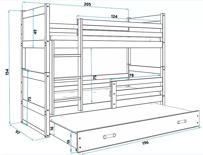 - Szuflada - wykonana z płyty wiórowej, posiada funkcję dodatkowego spania.