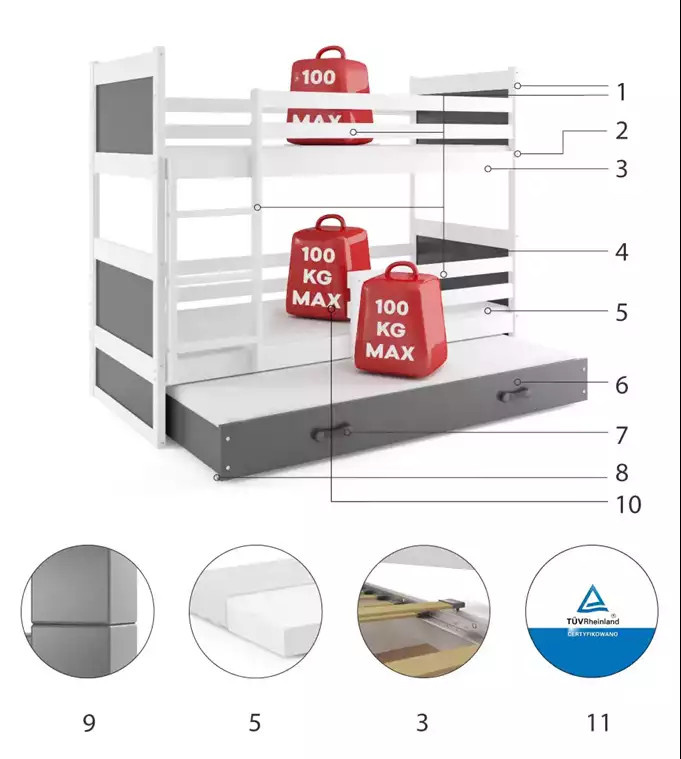 RICO 3 OSOBOWE RAMA BIAŁY WYPEŁNIENIA GRAFIT SZUFLADA GRAFIT BEZ MATERACY 90 X 200 KPL