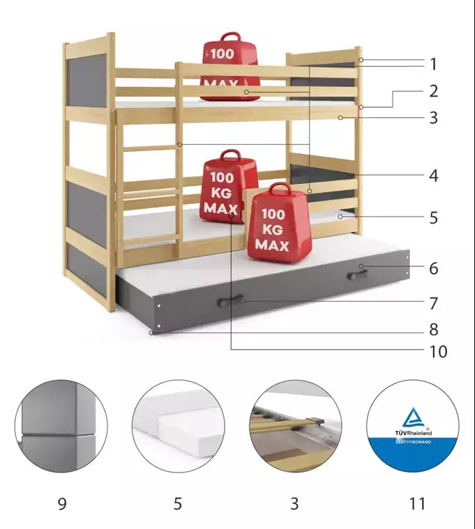 - Certyfikowane łóżko - jakość i bezpieczeństwo zgodnie z normami TUV.