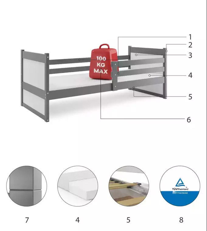 - Certyfikowane łóżko - jakość i bezpieczeństwo zgodnie z normami TUV.